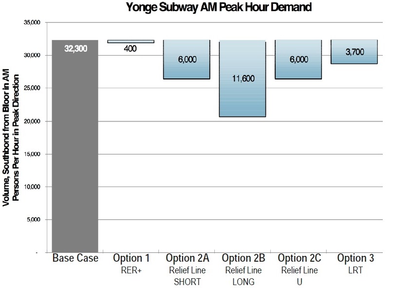Indeed, the Long Relief line would cut demand on the Yonge Subway by about 1/3 (11,600 riders out of 32,300), an impressive contribution to the network. It is hard to imagine a Yonge line with barely more than 20,000 riders on it in the peak hour.