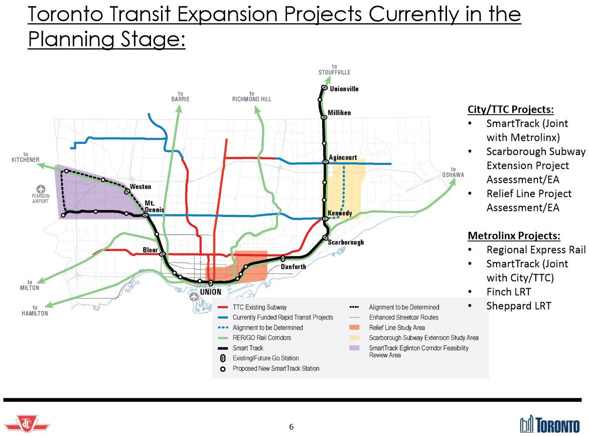 The TTC Board received an update from City and TTC staff on the status of major transit expansion plans in Toronto at its meeting of September 28. The presentation was largely delivered by Deputy City Manager John Livey with backup from Mitch Stambler, TTC’s Head of Service Planning. Also at the table, but notable for her silence, was the Toronto’s Chief Planner Jennifer Keesmaat. A contingent from Metrolinx, another agency studying transit expansion, was in the public gallery, but they did not participate in the presentation or discussion.