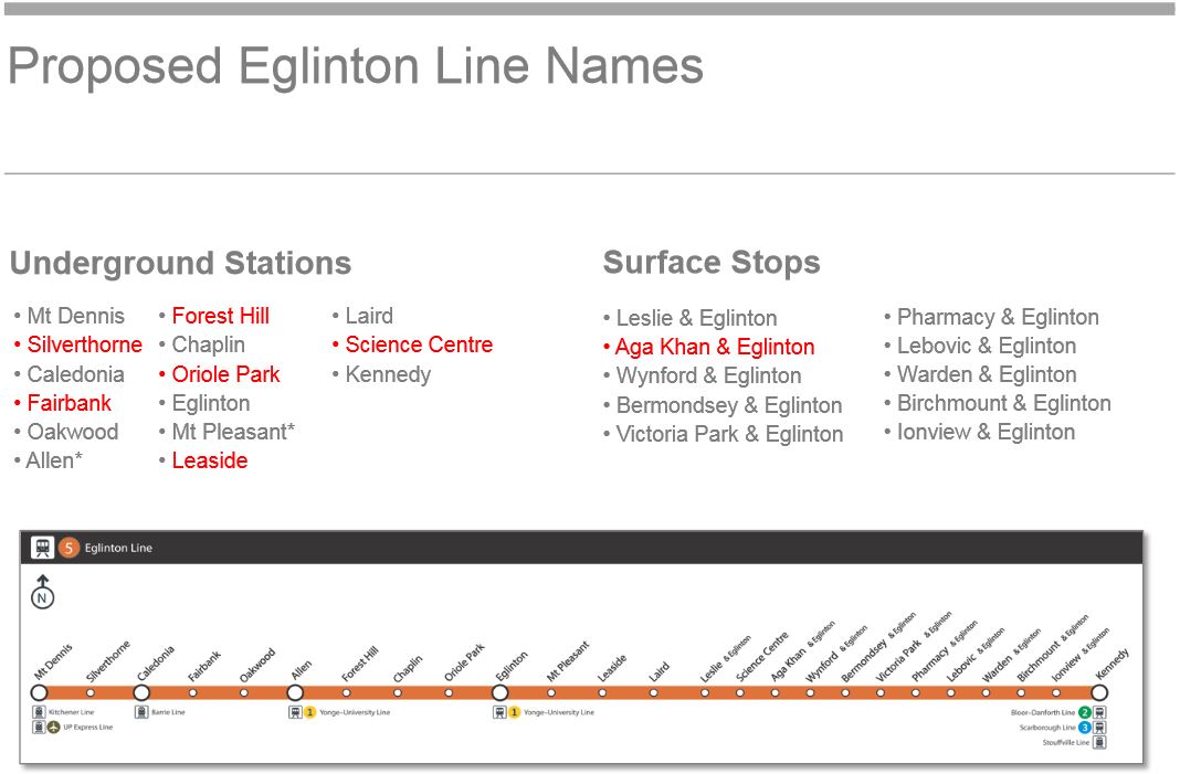 The asterisk beside “Mt. Pleasant” is actually an error, and should be beside “Eglinton” because the proposal recommends a “change” from “Eglinton-Yonge”. Of course, the station isn’t called that yet.