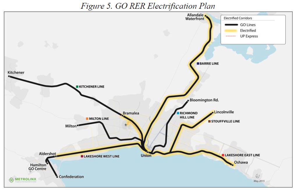 As with the RER service plan, the electrification is limited to corridors that GO controls, with the exception of the Richmond Hill line (owned by the Province from Union north to the crossing with the CN York Subdivision north of Steeles).