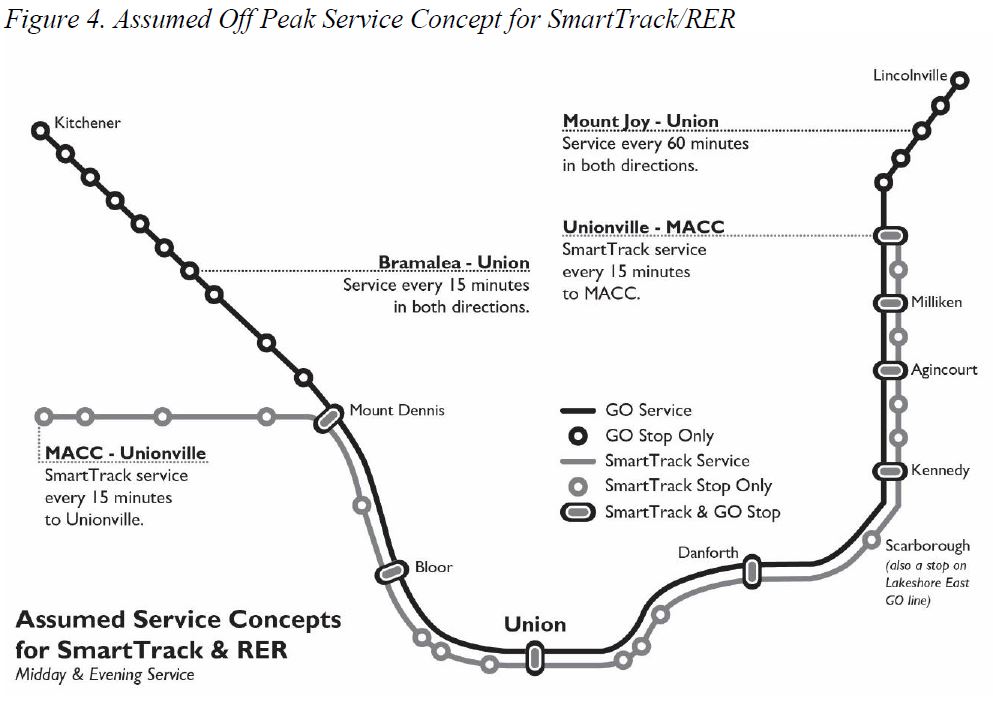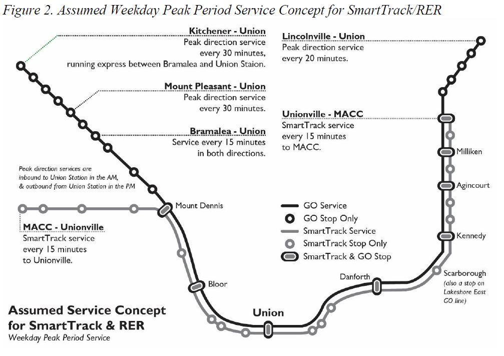 Several SmartTrack components were not included in the funded GO RER program. For instance, service frequency options better than every 15 minutes, fare integration, 11 new stations, and continuous service between Kitchener and Stouffville/Lakeshore East corridors at Union Station. The new western heavy rail spur connecting Mount Dennis to the MACC/Pearson Airport is also outside the scope of GO RER. [p 9]