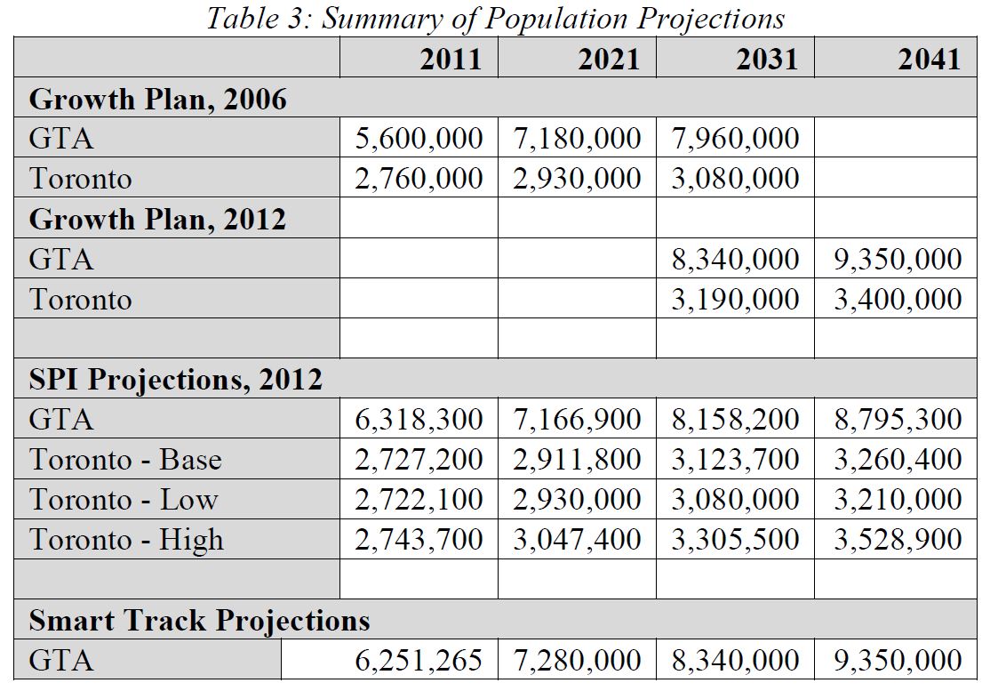 Population growth was modelled both for the basic data from past studies and the 2011 census, as well as on an enhanced basis presuming the existence of SmartTrack. This latter scheme is dubious because it presumes ST is sufficiently important that it would change regional growth at a measurable level as distinct from other city and transit network changes that might occur. Once again, the effect of ST will vary substantially with the service level actually operated. At four trains/hour, this is little more than an improved GO service, not a new equivalent-to-subway line. Moreover, the RER and other rapid transit projects will also contribute to growth. This smells of an attempt to goose projections on the ground that SmartTrack is uniquely able to stimulate growth beyond what might otherwise occur and even considering that it does not serve most of the GTA.