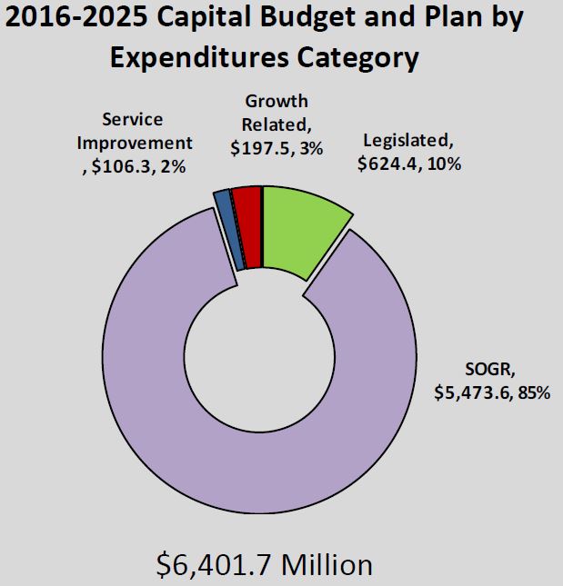 The Ten Year Capital Plan for 2016-25 includes just over $6-billion in proposed spending. As discussed in a previous article, this is nowhere near the total of the TTC’s capital needs, but stays within the City’s “affordability” target.