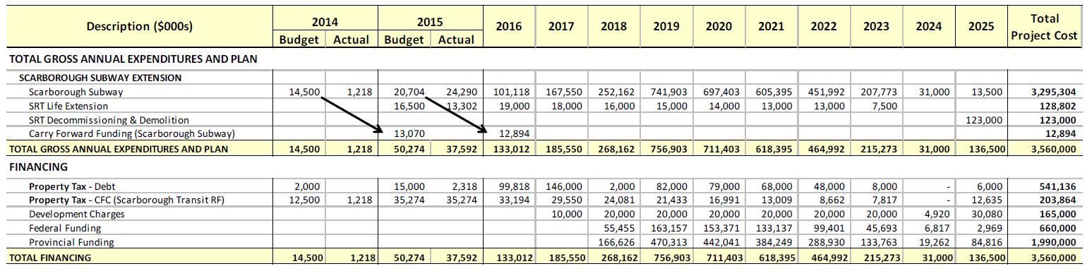 - A loss of hoped-for investment income from the Move Ontario Trust (which held Provincial subsidy monies for the project) of $85m as the trust was unable to achieve a 4% rate of return. This has been partly offset by redirection of surplus funding from TTC’s 2015 operations.