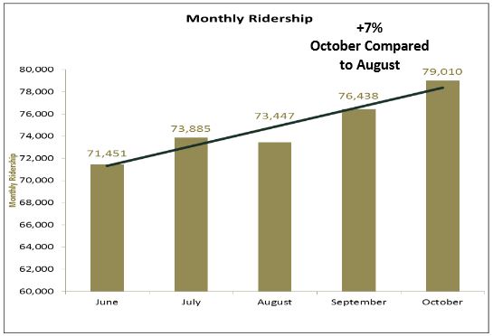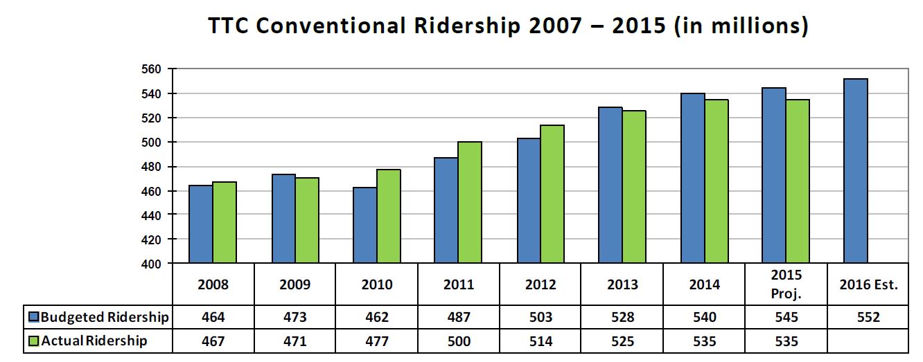 Since 2013, actual ridership has been below budget, and the 552-million figure for 2016 shown here will be a challenging target to meet.