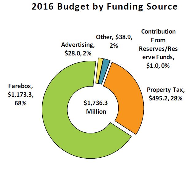 This chart is actually in error in that Property Tax does not supply all of the $495.2-million shown here. The City also receives Provincial Gas Tax revenue of about $160m of which $90m is dedicated to the Operating Budget where it appears as part of the City subsidy. (No Provincial subsidy is directed to Wheel-Trans.)