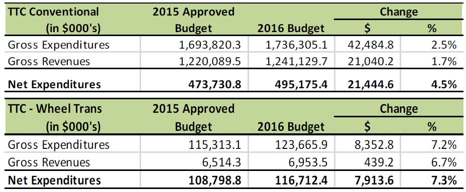 The Preliminary Budget included here is not the same as the TTC’s version because it omits $18.4-million in various TTC-approved improvements for 2016.