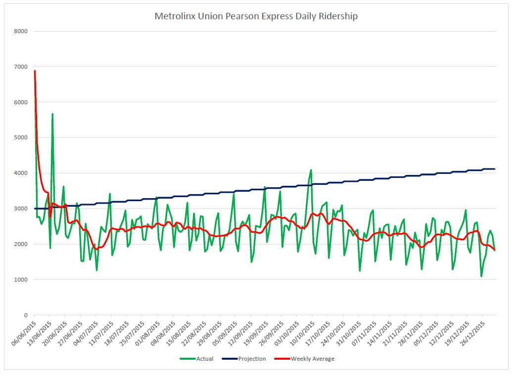 Metrolinx has updated their report on daily Union Pearson Express ridership to include the last two months of 2015.