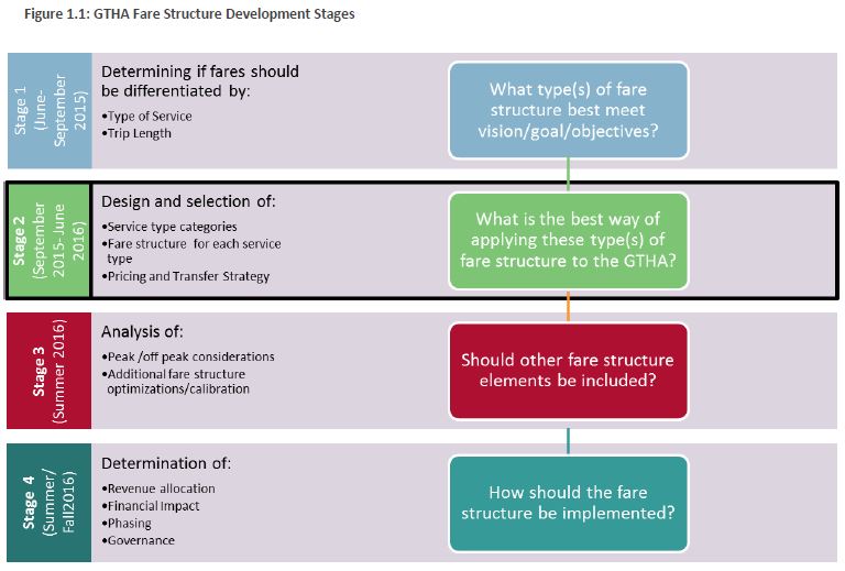 However, a more detailed chart (Fig. 1.4) clearly shows that a “Preferred Option” would be recommended by Spring/Summer with the implication that any chance to debate and influence the choice has a limited window of the next few months. The Metrolinx Board is not scheduled to meet again until June 2016. Will they be faced with a fait accompli where staff have made all the decisions and the Board’s role is merely to nod in agreement? When will local Councils and transit agency boards have their chance to be heard? In the rush to get a new fare structure, will Metrolinx management do an end run around meaningful consultation at both the general public and political levels?