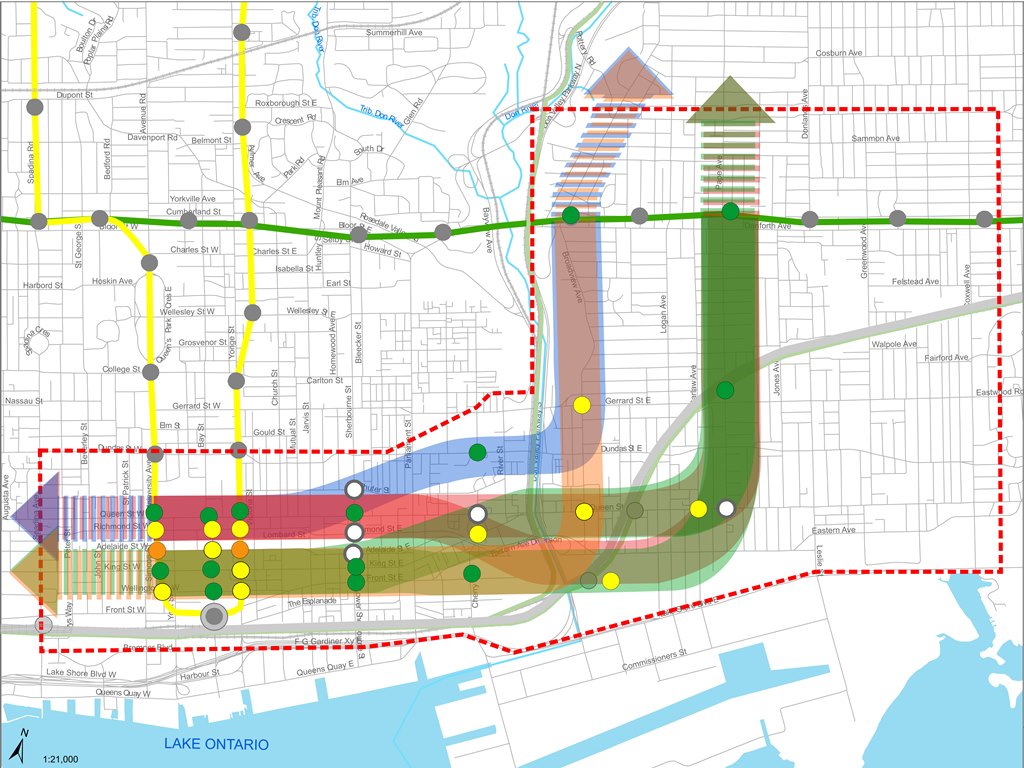 Of these, the two most promising were the Pape to Queen options with the only variation being whether the line ran to downtown via Queen or via King after crossing the Don at Queen Street. For this article, these are the only two whose demand projections I will discuss.