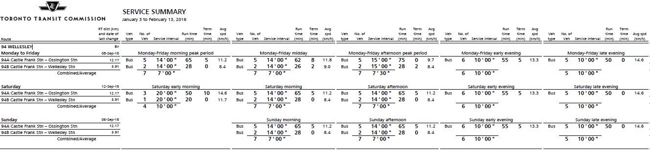 The scheduled service in effect for January 2016 on 94 Wellesley is shown below (click to enlarge).
