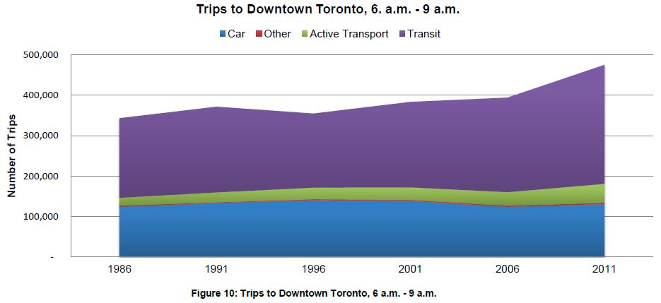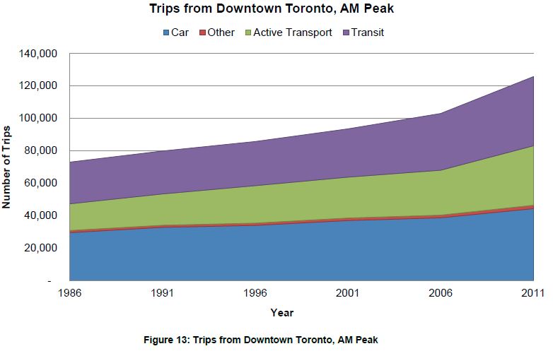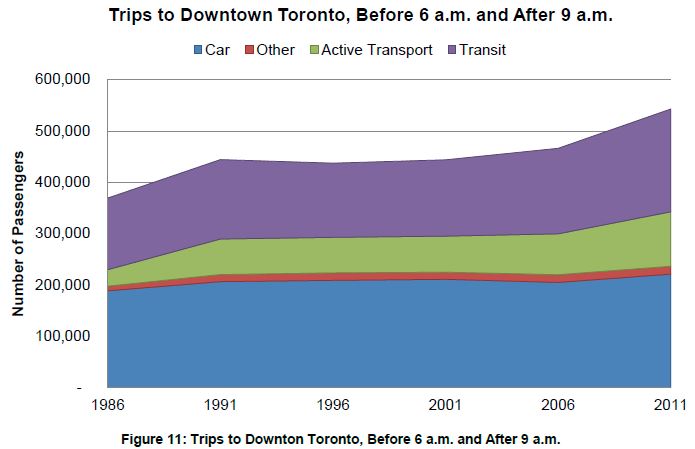 Between 2006 and 2011, average daily car trips to the downtown outside the morning peak period grew by 16,000, compared with less than 4,000 by GO Rail. Meanwhile, over 55,000 new trips were made by walking, cycling and TTC. [p. 10]