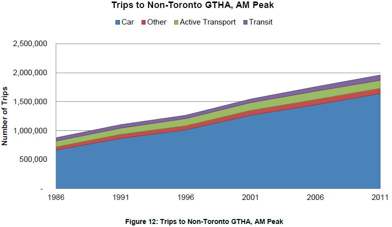 Auto trips are growing outside the peak as anyone now dealing with off-peak congestion will know. GO, a peak-only service, has not seen much of the overall increase.