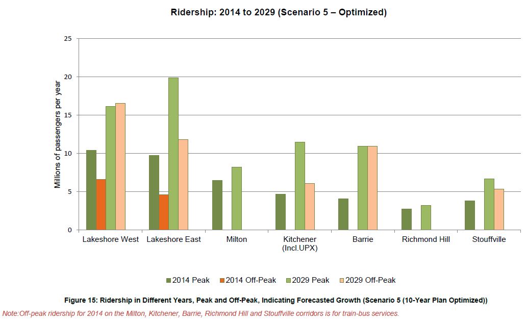 • Although the base 2014 ridership is not shown, it can be derived from the 2029 ridership and the percentage increases this represents. For Lakeshore West, the 2014 number is 17m, and for Lakeshore East it is about 14.5m. The scale of ridership increase has profound implications for the capacity that will be required to and from feeder stations.