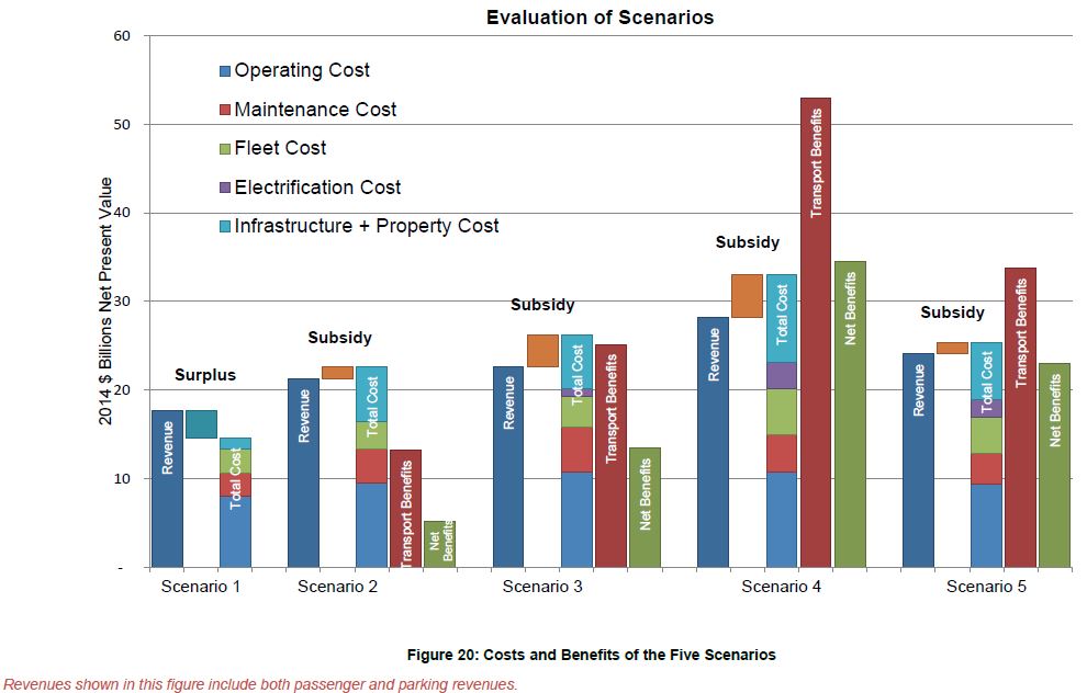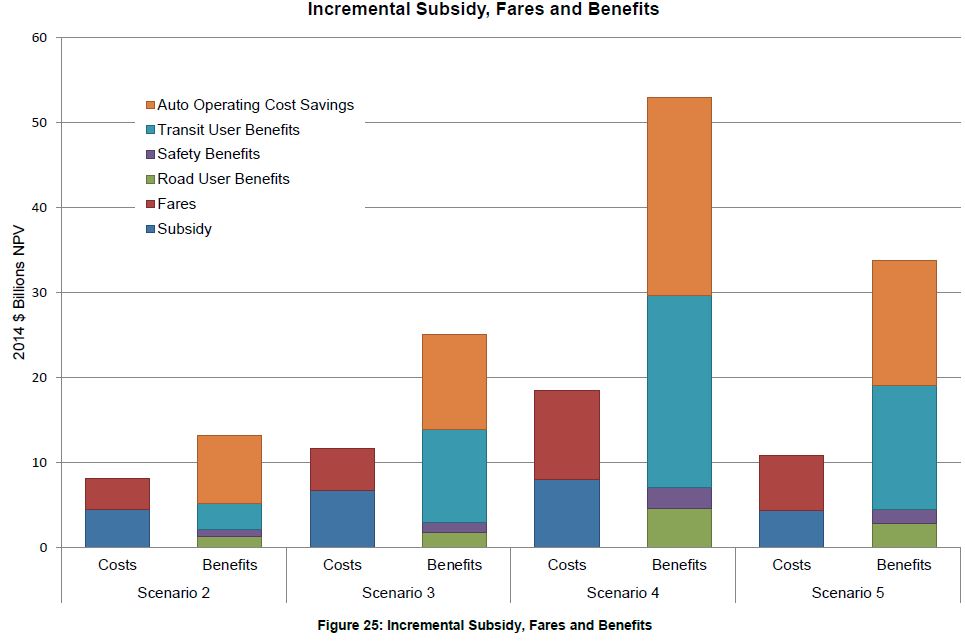 “Business Case” analysis is something of a black art, and much depends on assumptions used in the model such as the value of travel time, presumed changes in road congestion, reduction of pollution, and secondary effects such as reduced health care costs. For the five scenarios, the analysis produces the following result: