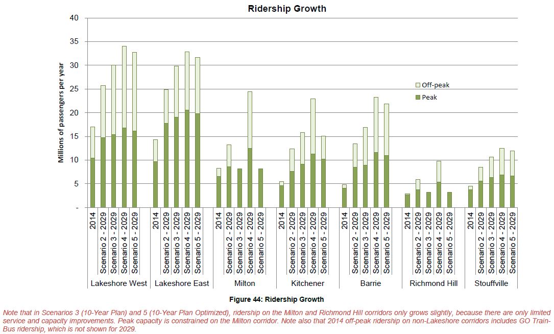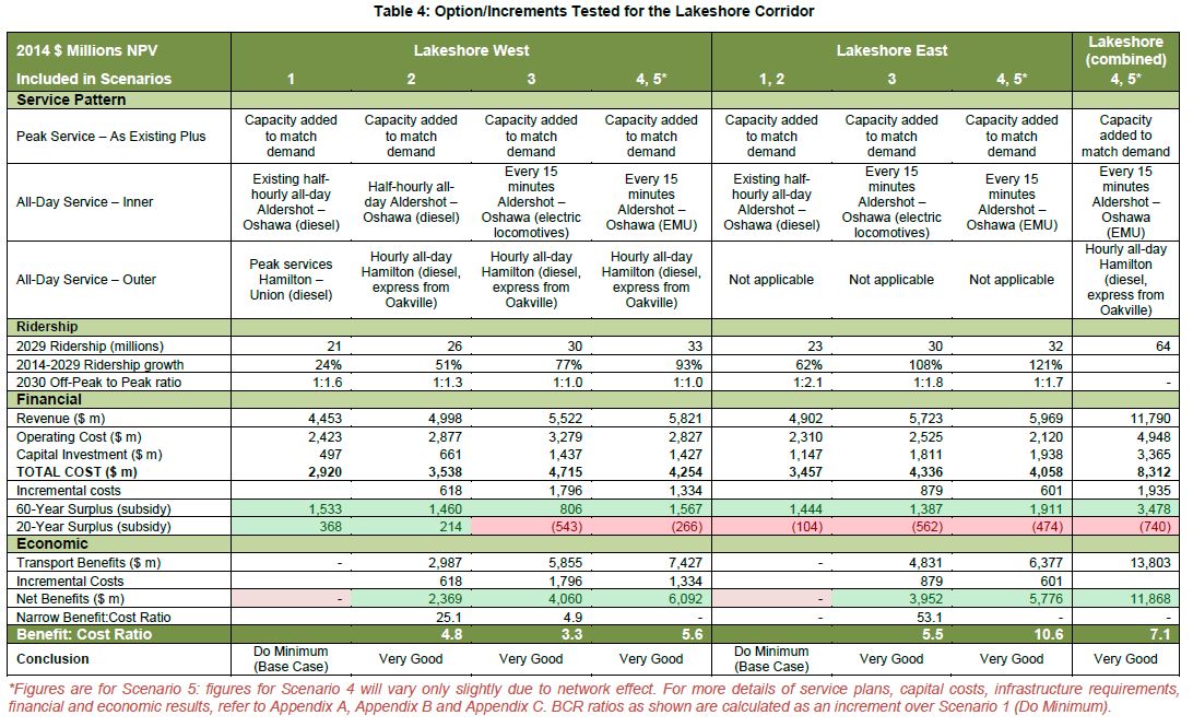 The estimated capital costs rise from $5 billion for scenario 1, through $10b, $12b and $19b for scenarios 2 to 4. The price tag for the latter is well above what Queen’s Park has available, and scenario 5 was developed with a projected cost of $13.5b. All but scenario 4 are said to be achievable by 2024. Given that it is now 2016, and this is a 10 year plan, that date probably requires some adjustment.