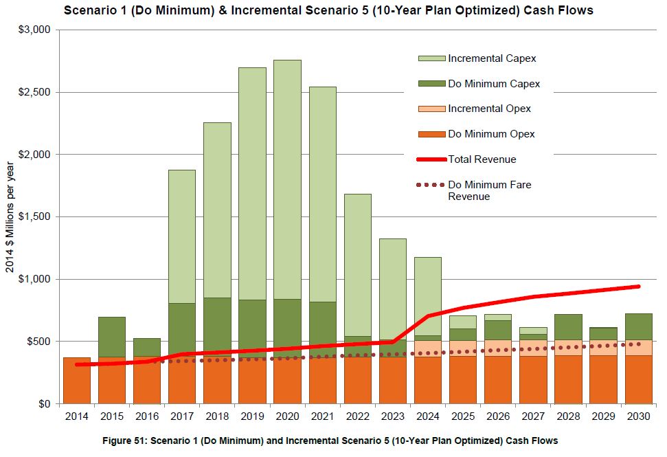 • Parking: should GO parking lots charge for this service, and how much can this revenue source contribute to overall financing? The report estimates that parking could contribute $100m annually from 2020 onward, enough to finance $3.8b in capital spending.