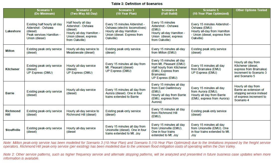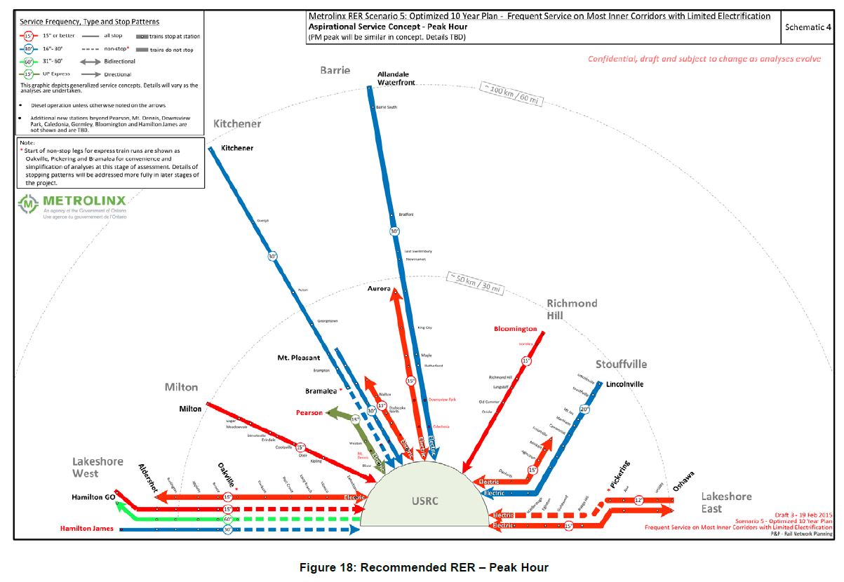 Scenario 5 is the 10-Year Plan Optimized, it represents significant progress towards implementing the service levels of Scenario 4. It goes beyond the investments and service included in Scenario 3 (10-Year Plan), with electrification also to Bramalea, Barrie, Stouffville and to Pearson Airport. This scenario and the resulting recommended RER program has been defined to maximize return on investment while mitigating risks. Depending on resolving various challenges, it can be delivered over 10 years for approximately $13.5 billion. It does not preclude, but rather prepares for, services to Milton and Kitchener to be eventually electrified and frequent all-day services introduced when agreement is reached on co-existence of GO and freight on these privately-owned corridors. [p. iv, Full Report]