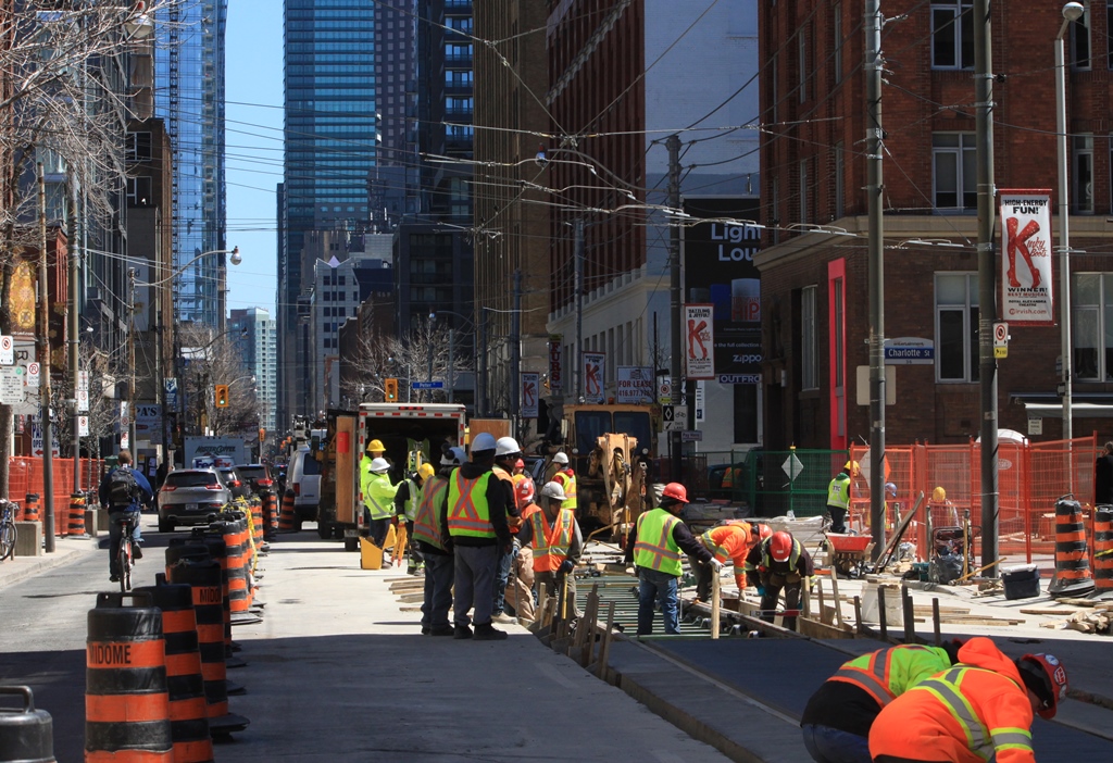 IMG_6455w Published May 9, 2016 at 1024 × 702 in Streetcar Track Construction Update: Spring 2016 (Update 2)) ← Previous Next → Looking E on Adelaide at Charlotte 2016.04.14