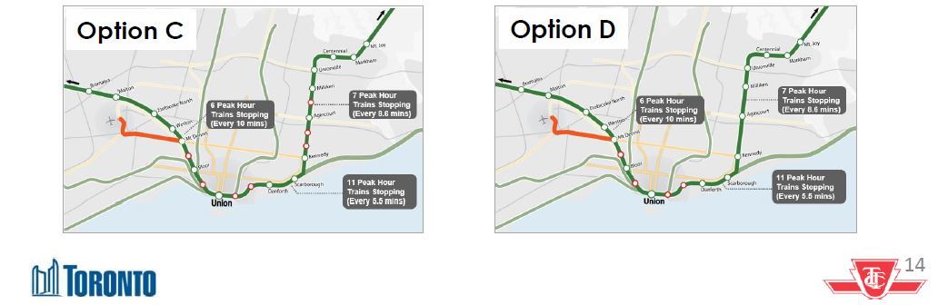 In Scarborough, the absence of a subway station at Lawrence East is explained away by the presence of a SmartTrack station where the RT now stops. However, with a train every fifteen minutes, riders may long for the day when their major complaint was the inconvenient transfer from RT to subway at Kennedy Station. Oddly enough, Lawrence East ST station was not included in one of the two configurations proposed earlier in 2016, but it has reappeared as a necessary adjunct to the “one stop subway extension”.