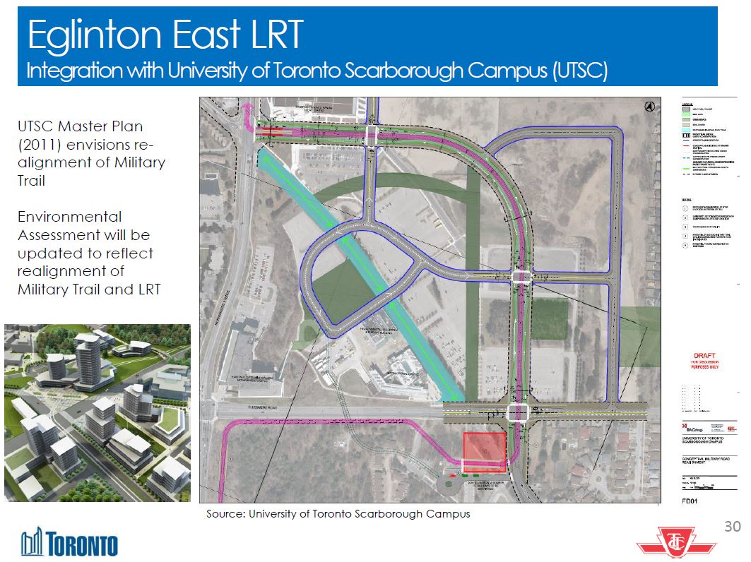 The Eglinton East LRT will run from an underground loop at Kennedy Station, surfacing on Eglinton and then going east via Eglinton, Kingston Road and Morningside to the University of Toronto Scarborough Campus. On Morningside, the line will run on its own structure over the Rouge River and then loop through UTSC looping ending, initially, beside the Pan Am Aquatic Centre.