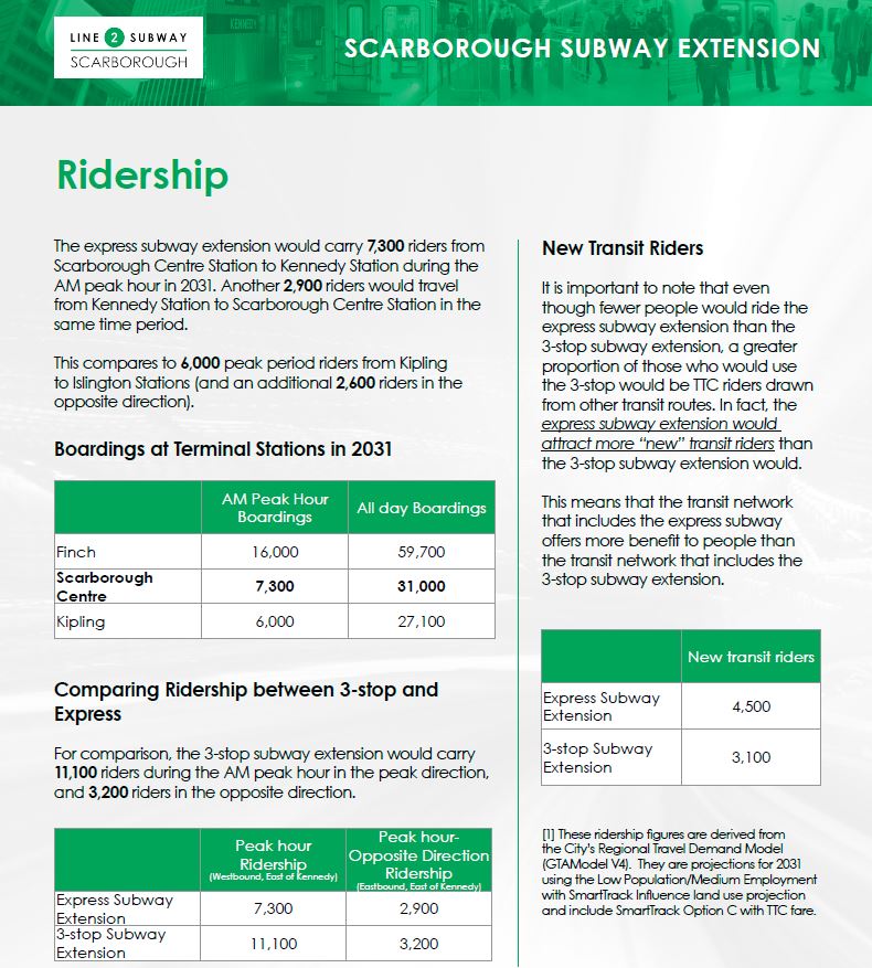 In a particularly convoluted argument, the presentation claims that although peak period ridership for the 1-stop line will be only two thirds of the 3-stop version, this is somehow “better” because the express line will attract more new riders. What is unclear is whether those riders might otherwise have been attracted to SmartTrack or GO rather than to the express subway as demand models are notoriously sensitive to travel time in making trip assignments.