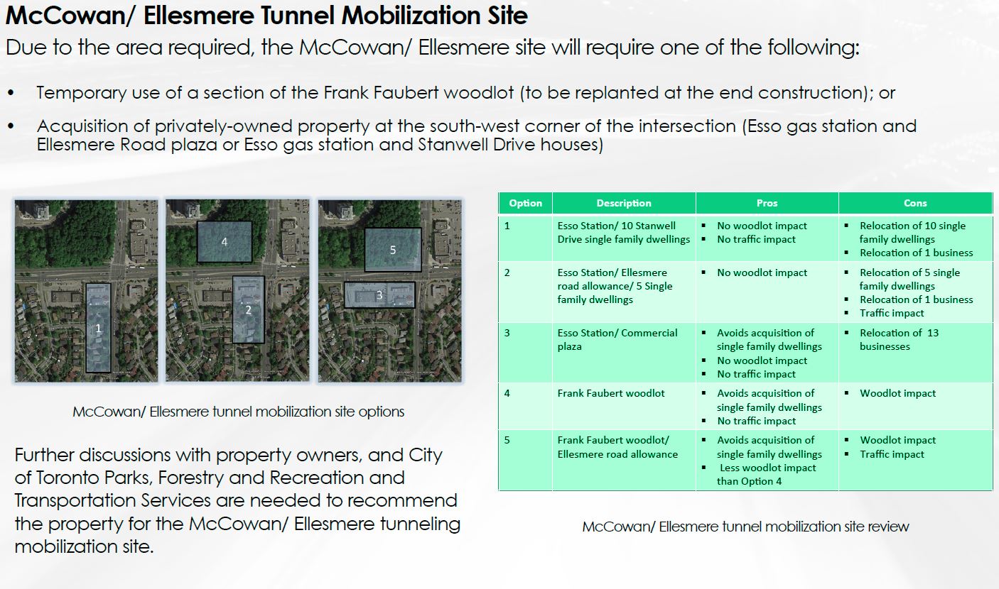 The tradeoff is between the acquisition of commercial or residential property, or the cutting of a substantial chunk of the Frank Faubert woodlot. Which of these wins out remains to be seen, but my own preference is to stay within the commercial property which can be redeveloped after subway construction is completed, but there is no “perfect” solution unless the launch site were completely removed from this intersection. Where else it might go is a challenging question, and the presentation gives no indication of whether other locations were considered.
