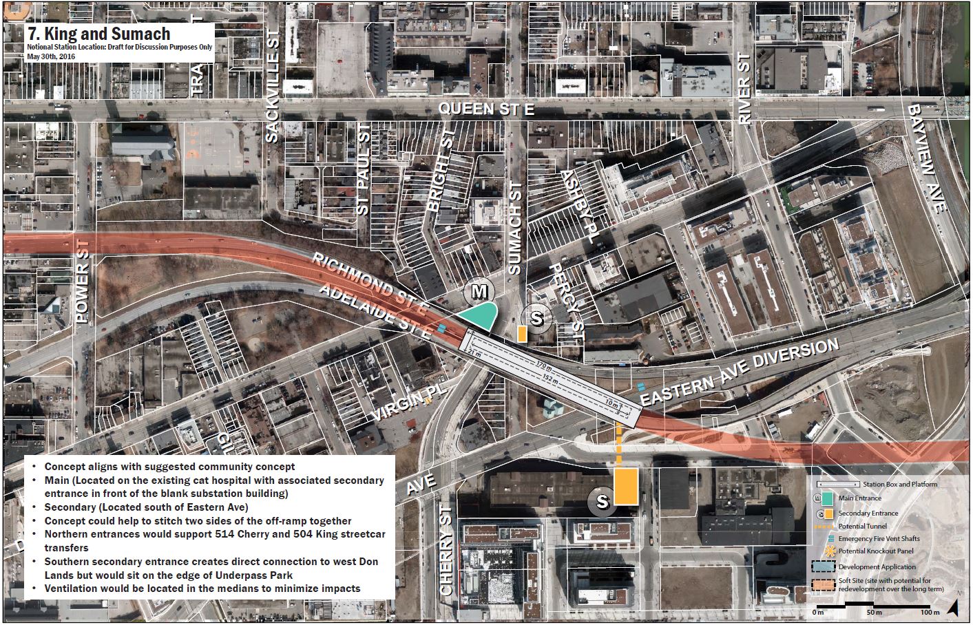 The proposed station at King and Sumach makes a much better connection with the transit system (King 504 east-west and Cherry 514 south) than a station at Queen would have. Nestling under the Richmond-Adelaide ramps from the DVP, the route threads its way through a tricky neighbourhood. The shift back north to Queen is not shown in the drawings, and the generic maps show the alignment passing directly under a large church at Queen and Power Streets. Some fine tuning is needed here.