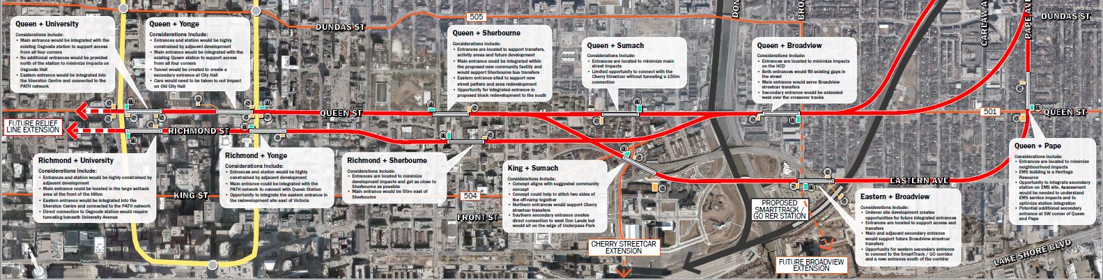 Closer to downtown, the Relief Line was originally to sit entirely at Queen Street, nominally for technical reasons related to construction, but also no doubt so that it would not compete with Smart Track as a service to the Unilever site. Fortunately this design was rethought in the most recent round of consultation, and the Relief Line now serves Unilever as part of a transit hub.