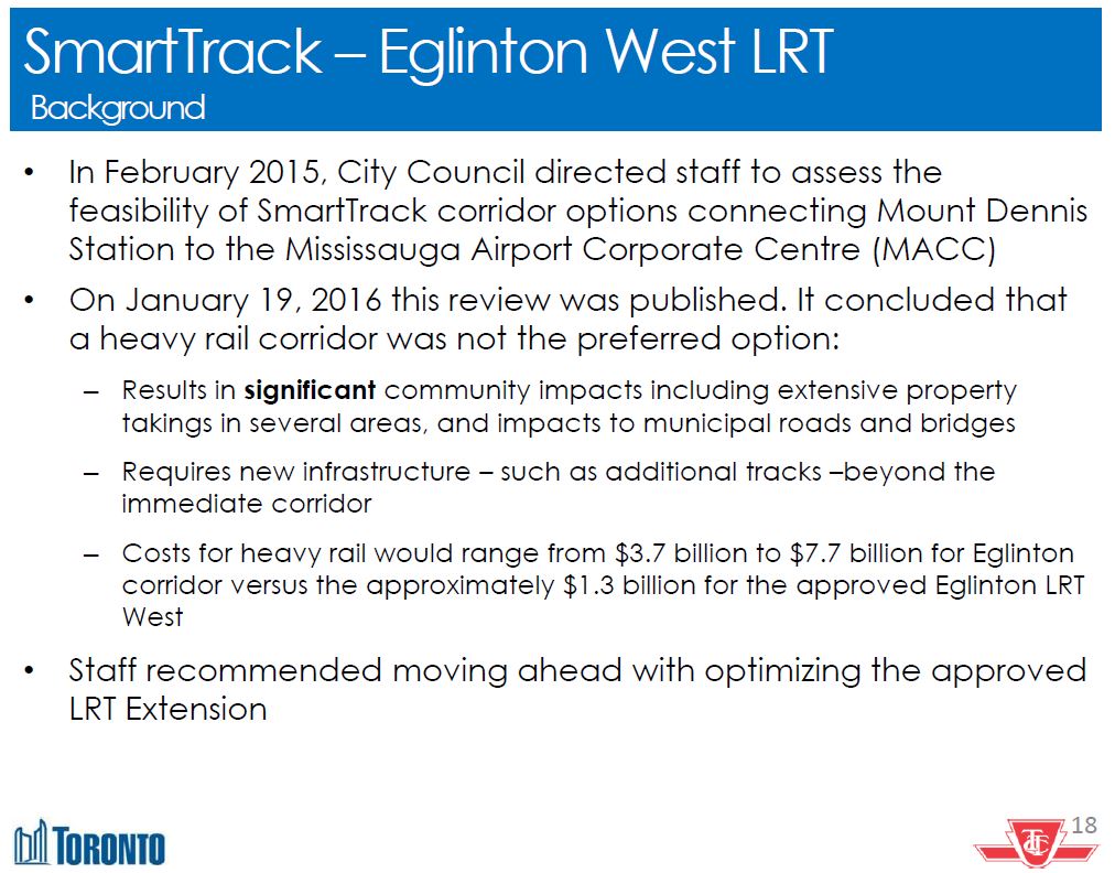 In all of the presentation materials, the most threadbare, the least informative, is the section dealing with SmartTrack. This is no surprise given that the original plan was little more than an election gimmick, but it has morphed into a central part of Mayor Tory’s program without benefit of many vital components.