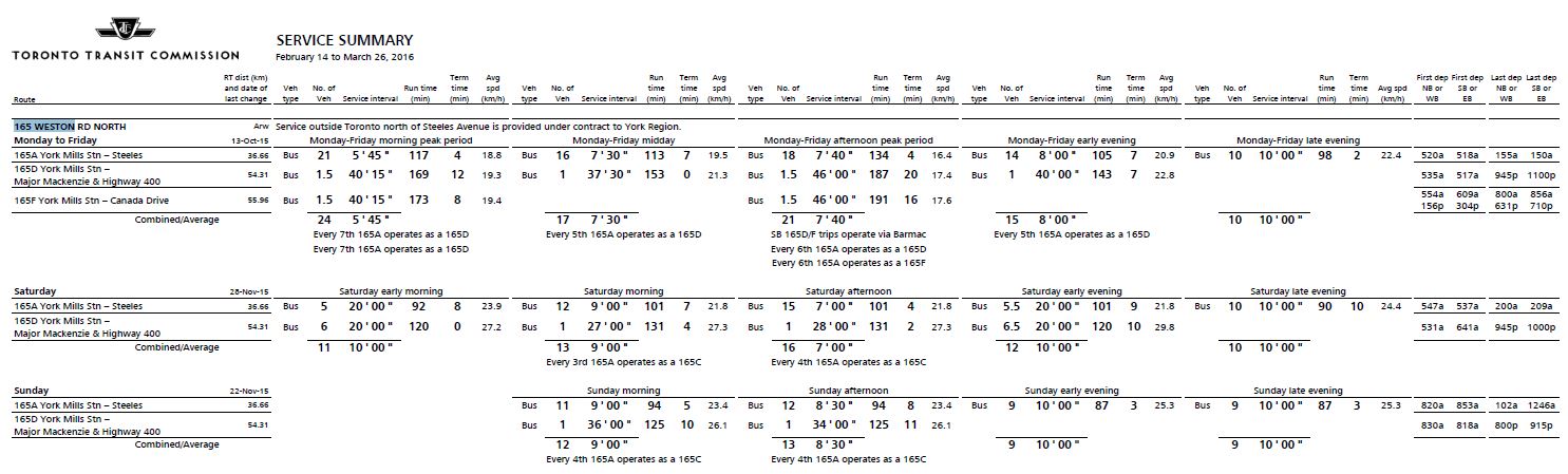 Once the 165 branches off from Wilson Avenue onto Weston Road, reliability of service becomes more important because there are no other routes to fill in the gaps. However, the 165 operates with a range of headways wide enough to guarantee service that is more irregular than the TTC’s target value.