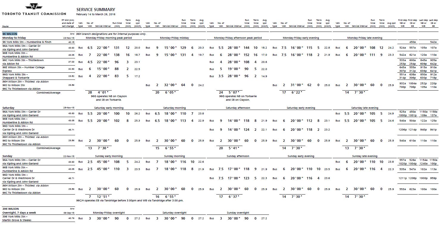 Until March 27, 2016, service on Wilson Avenue was provided by 96 Wilson and 165 Weston Road North with most trips originating at York Mills Station.