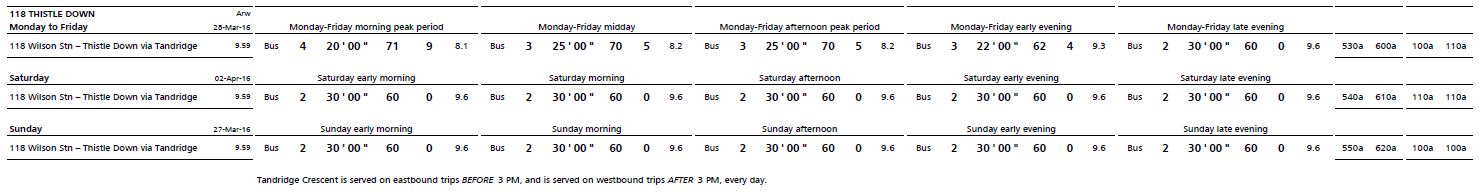 In September 2015, the Thistle Down service was a branch of the Wilson route. The scheduled headway was quite wide, near 30 minutes during most periods. The SD values for outbound headways are quite high, and they are little better for inbound service. This shows that the benefit of a terminal where recovery to “on time” might occur had little effect. A 10 minute SD is quite high, indicating that a considerable amount of the service ranged up to 20 minute headways, and the timetable was effectively meaningless.