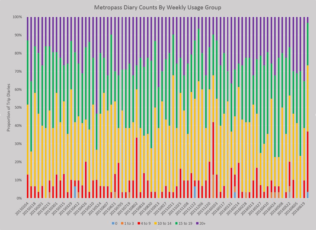The first chart shows the proportion of diaries each week falling in various bands of usage. Of the diaries, about half fall at or below the 10-to-14 trip group, while the other half are above. The proportions vary each week, and effects such as holiday weekends show up as a drop in the more frequent riders.