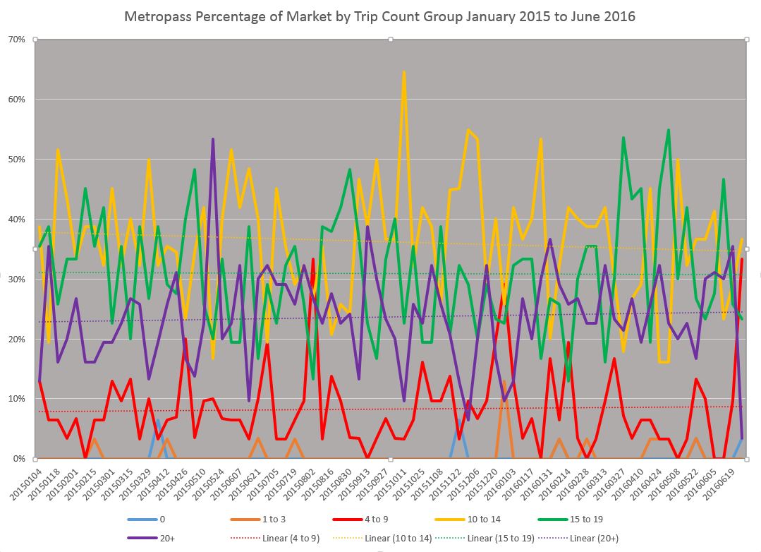 The trip diary data covered in this article do not include a fare change for the Metropass, and the pricing multiples actually fell in 2016 because token and ticket rates went up while pass prices were frozen. This freeze was a direct response to experience a year earlier when pass sales dropped after the price went up.