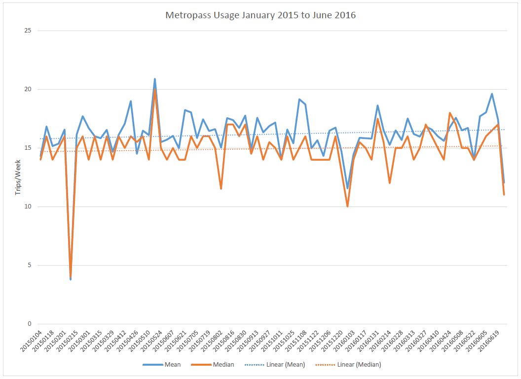 There is a very slight upward trend in both values over the 18 months, but not much. Although there are week-by-week variations, the long-term numbers are consistent. This suggests that those riders who have stayed with Metropasses are using them at roughly the same rate.