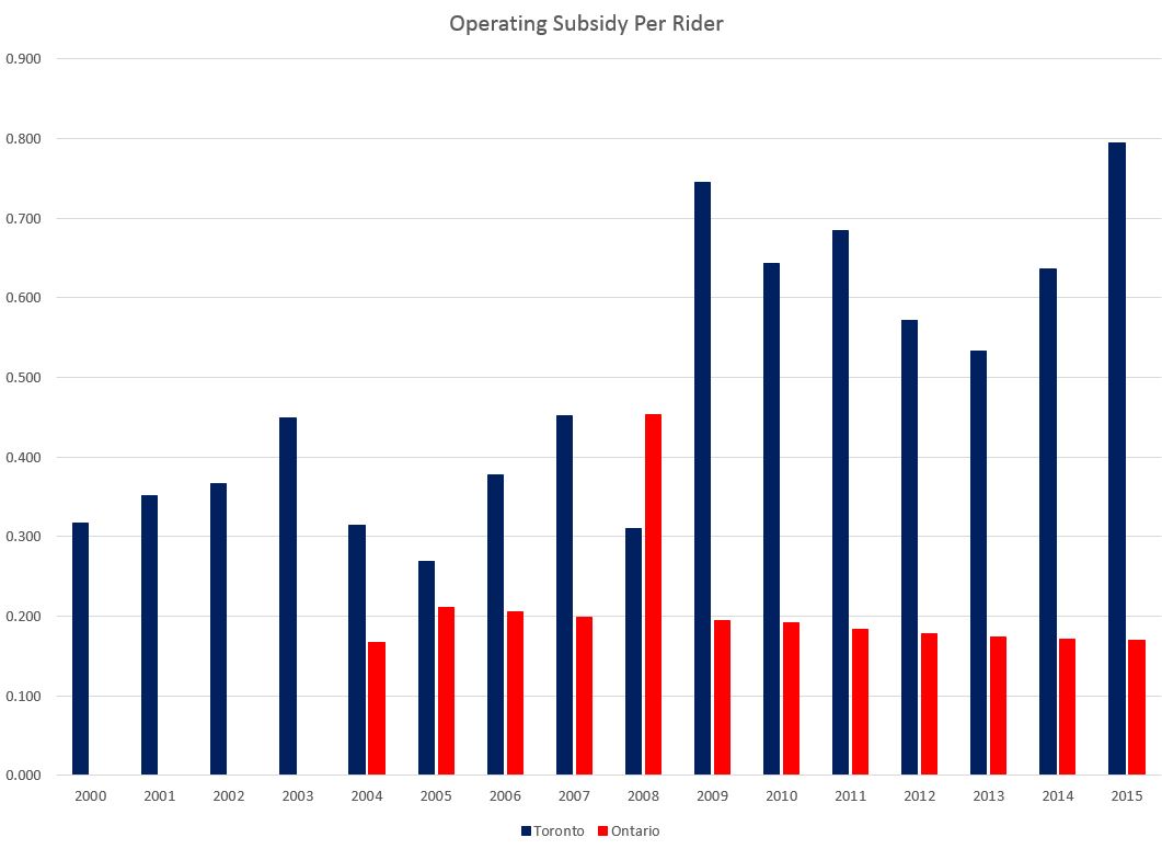 Commissioner Mihevc raised the perennial question of getting more money from Queen’s Park as an alternative to higher fares, taxes or service cuts. In doing so, he is longing for an era over two decades ago when Ontario paid 50% of the TTC’s operating subsidy, an amount that would roughly have been $305m in 2016. The actual subsidy from Queen’s Park is about $90m which comes from the Provincial Gas Tax allocated to the City of Toronto (a further $70m from this source goes to the Capital Budget).