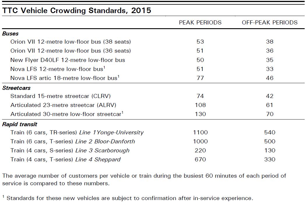 Here are the current loading standards for TTC vehicles. Note that these are based on averages over a peak hour and some vehicles will have more passengers while others are half-empty either due to bunching, or because they are short-turned and are of little use to many riders. The TTC only reports averages, not max-min values nor standard deviations.