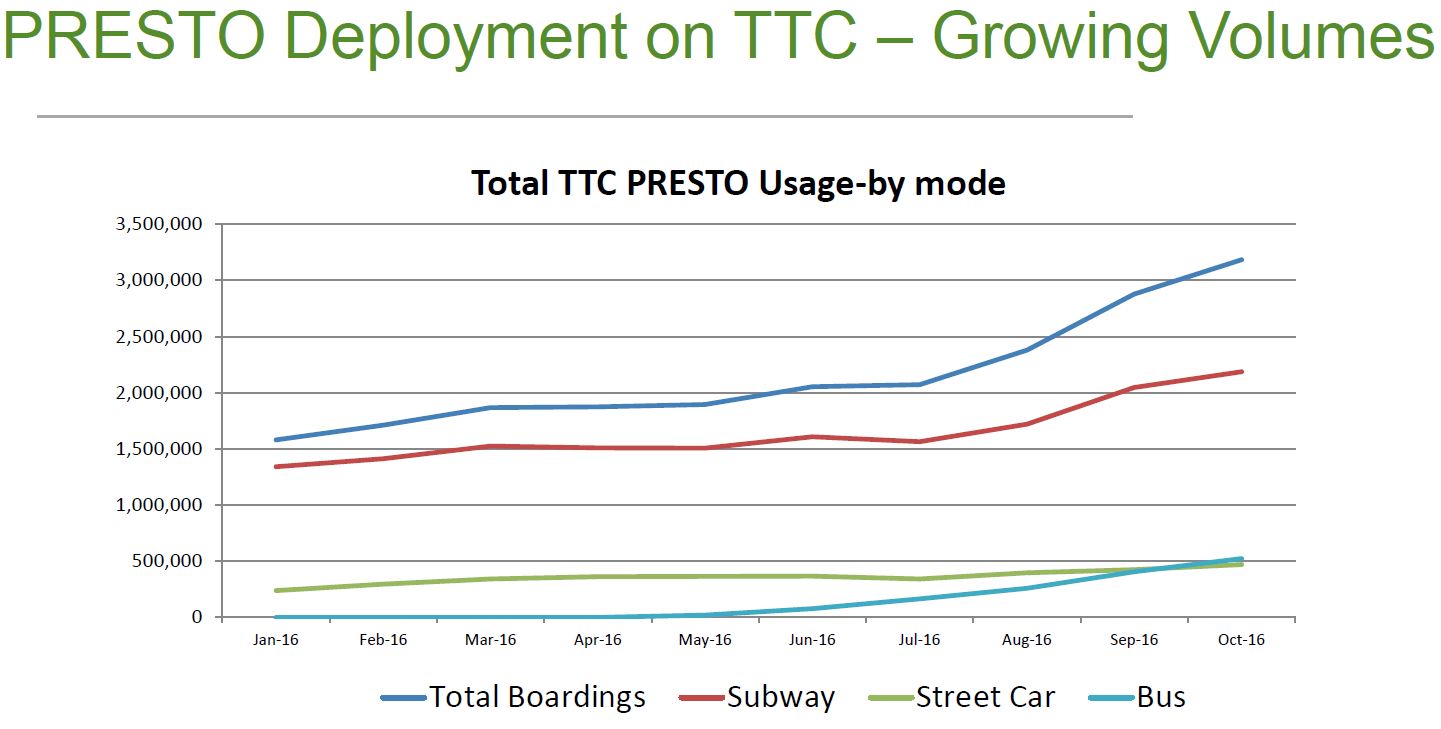 To put this into context, the TTC carries about 1.8 million rides every day and the “unlinked” trip count roughly doubles this number. (This counts each leg of a journey as a separate transaction, a Presto “tap”, and, on average, each rider transfers once). The monthly volume shown above is in the same range as the daily volume a full roll out on the TTC will bring.