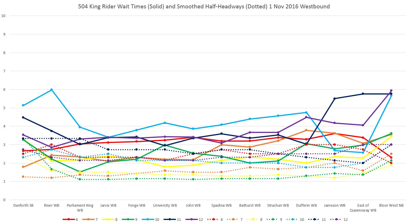 In these charts the solid lines represent the rider wait time in minutes/passenger while the dotted lines are the average that would have applied if all of the service had been evenly spaced over an hour. Each colour shows data for a different hour through the day, and the horizontal positions show various locations along the route. Note that the rider wait times are generally higher than the average times implied by the vehicles/hour.