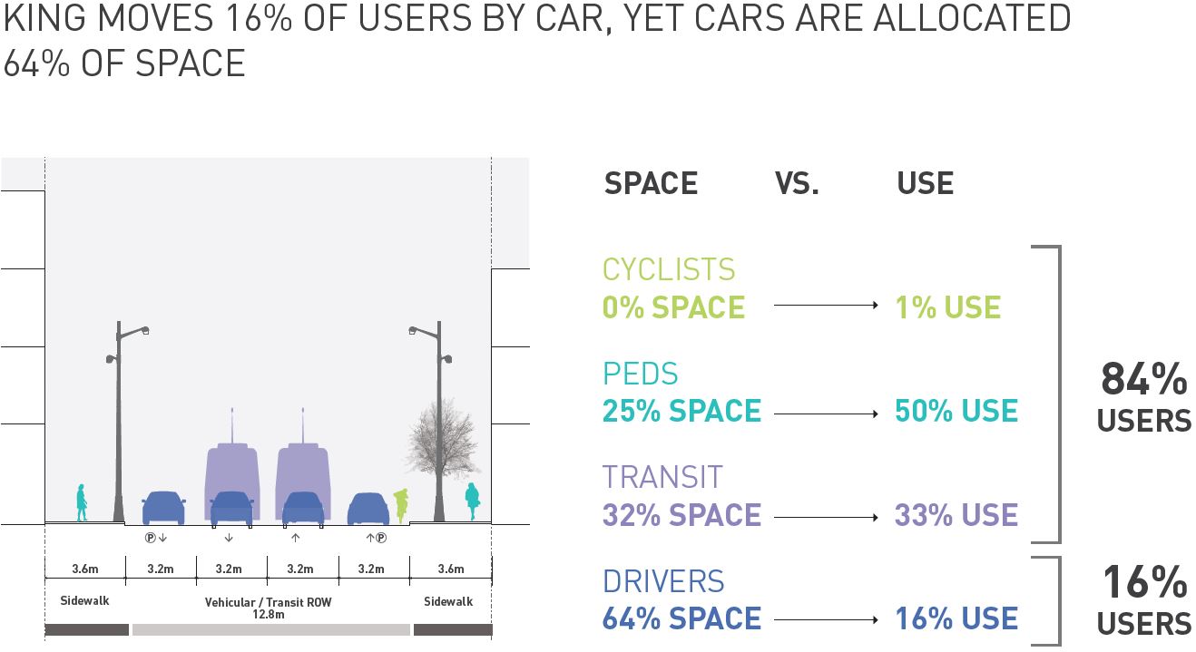King Street users are overwhelmingly pedestrians, not motorists, and yet the lion’s share of space is dedicated to cars, not to transit and those on foot.
