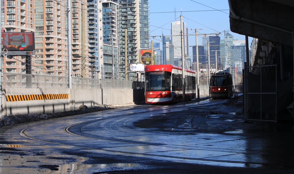 img_7222w Published February 18, 2017 at 1024 × 607 in Exhibition Loop Reopens For Streetcars ← Previous Feb. 18/17: North side of the loop with a Flexity on the spare track and a revenue CLRV passing.
