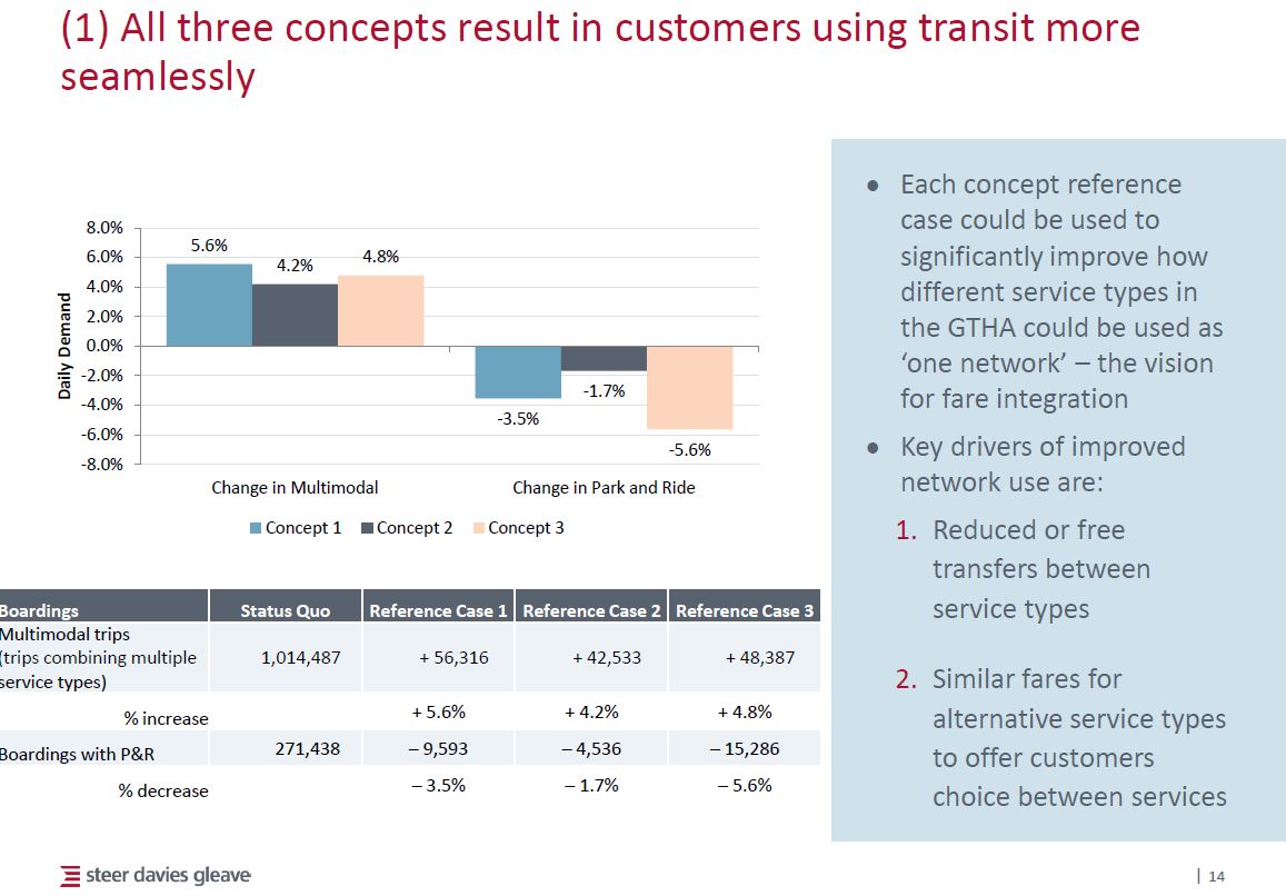 If one considers “seamless travel” to be a goal, then the idea of having more people use multiple systems a “good thing”. However, the analysis is silent on the effect on trips that only use one “mode” but would still be affected by a new fare structure. One “benefit” shown here is a slight decrease in Park & Ride travel implying a slight shift to local systems for access to GO or subway services. This decline is small, and would be quickly eaten up both by ridership growth and by latent demand. Indeed, GO faces the problem that it is a very large operator of parking lots and structures that both waste space just where development would be most “transit oriented”, and which cannot easily be expanded as GO stations are now hemmed in by urbanization.
