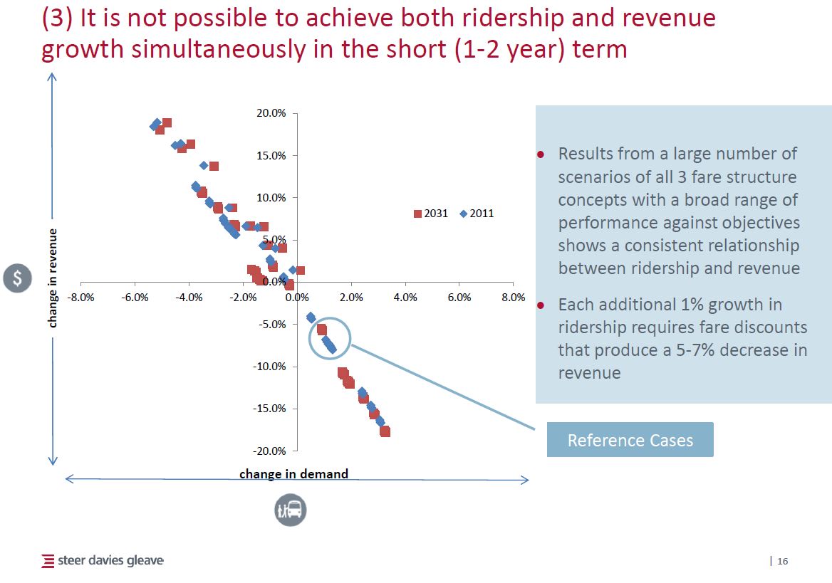 Encouraging ridership requires fare discounts that decrease revenue. There is a hoped-for long term benefit, but the business case numbers described above depend on indirect costs such as reduced health care and environmental effects through declining auto travel, not on direct operating costs. Indeed, some of the “benefit” included above is generated by the very discounts that produce the revenue losses here.