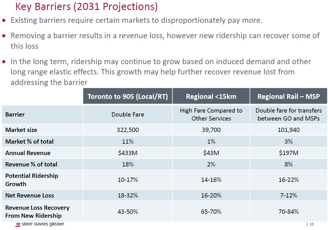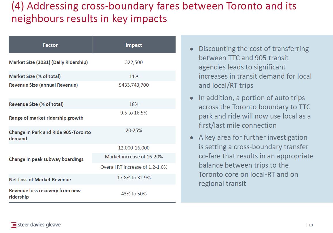 Again, the emphasis is on analysis of cross-border trips with no discussion of the much larger volume of existing transit trips. The increase in rapid transit trips, particularly on the subway, is troubling at a time when the TTC is hard-pressed for capacity. By reducing the cross-border fare, are we enrouraging riders who should be on long-haul GO trains to shift to the local subway system?