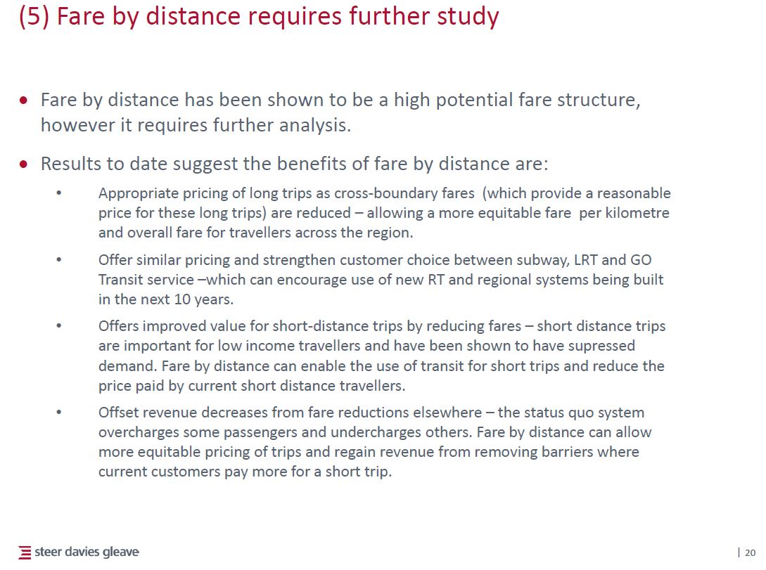 Back in June 2016, Metrolinx received two reports from its consultant, Steere Davies Gleave, that give some insight into the work and philosophy to that point on fare by distance schemes that Metrolinx contemplated.