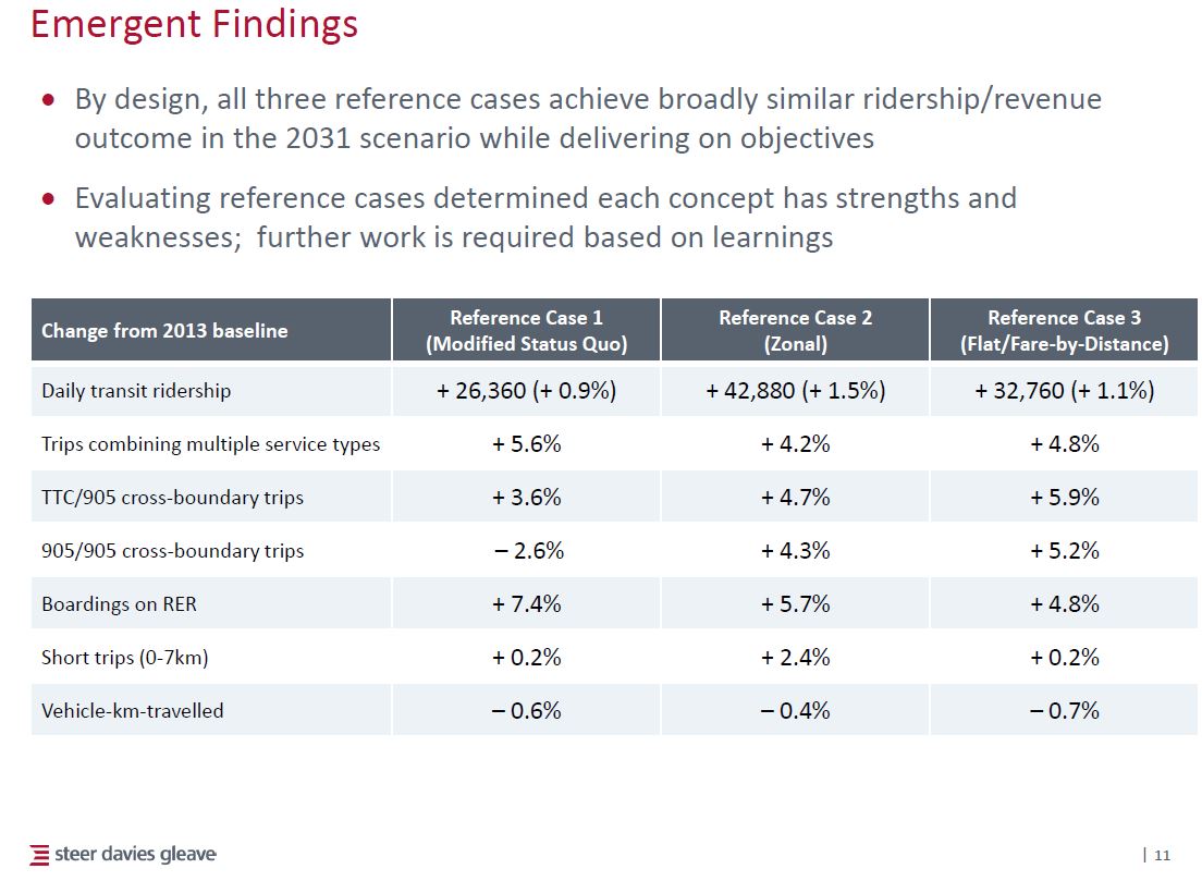 This chart shows that the consultants looked at many variations in possible fare structures, but only one was illustrated for each of the three options as a basis of comparison. I have asked Metrolinx for details of the additional scenarios, among other information to explore just what the consultants actually reviewed.