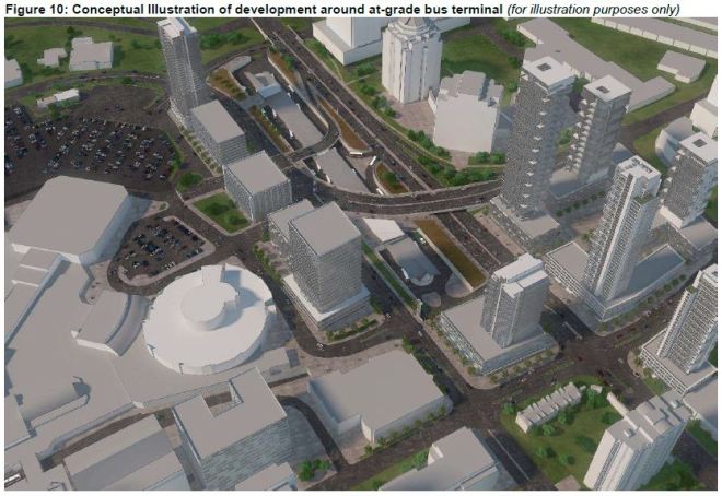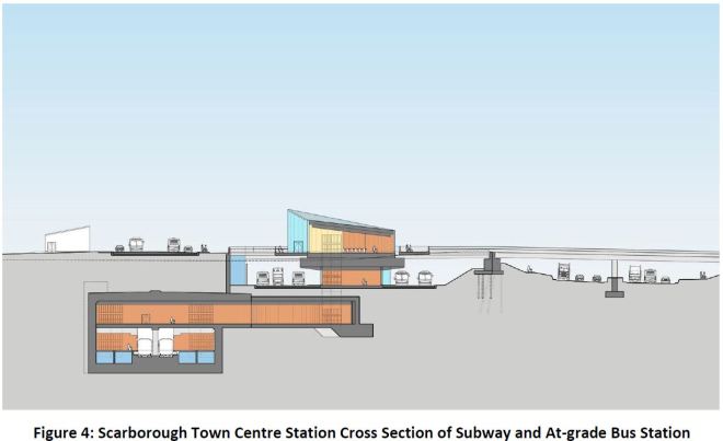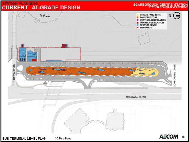 Another proposal for the terminal is that its size be reduced in recognition of sending some bus routes to SmartTrack stations rather than to STC. This is a rather odd concept considering that the terminal is intended not just as an interchange between bus routes and the subway, but within the bus network itself (including regional connections). If the assumption is that everyone arriving by bus wants to go downtown, then they could just as easily be delivered to any available GO station provided that issues of capacity and fare structure were dealt with. However, getting around within Scarborough would be a secondary consideration.