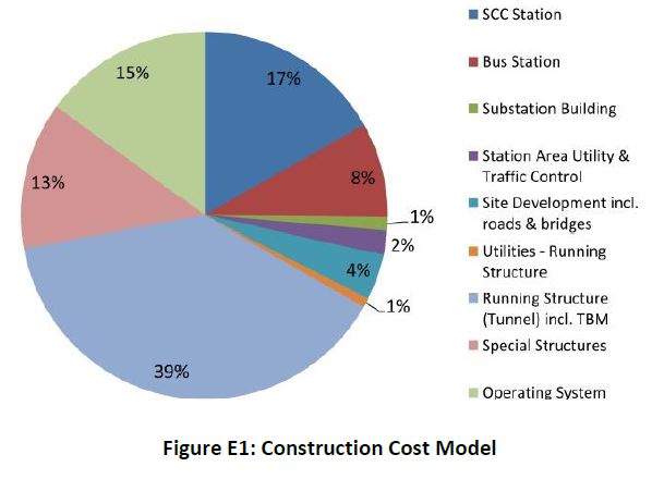 It is worth understanding the breakdown of the project’s cost. Structures of various kind make up the lion’s share of the total, and it is here that the changes would have the greatest effect. The chart below is based on costs that do not include the proposed Triton Road bus terminal, and so that component of the total is understated.