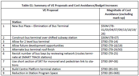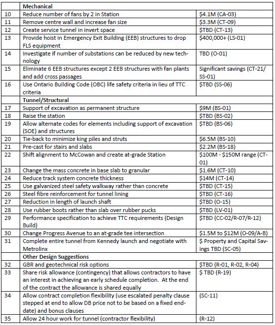 A table of the 35 proposals lists potential savings for some, but the majority are “$TBD” (to be determined). One of the major proposals, a redesign of the originally planned bus terminal, has already been incorporated in the project. This wound up costing more and the project cost estimate went up, not down, as a result. The offsetting value is that a long strip of land along the McCowan Road side of STC is opened up for development rather than being dedicated to a bus terminal.